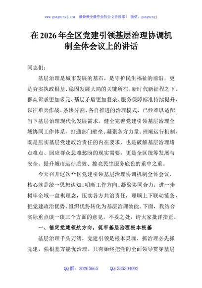 / 在2026年全区党建引领基层治理协调机制全体会议上的讲话