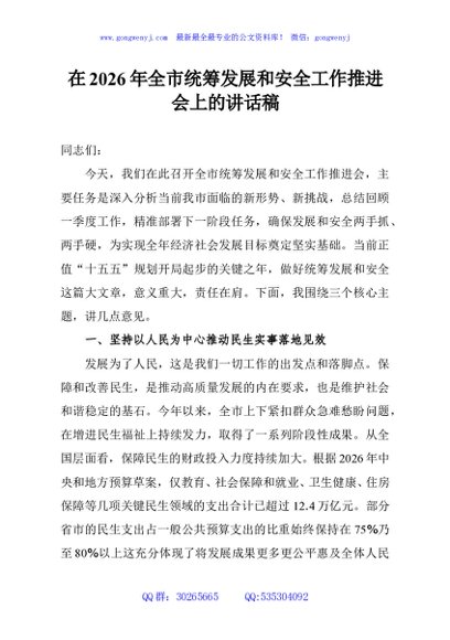 / 在2026年全市统筹发展和安全工作推进会上的讲话稿
