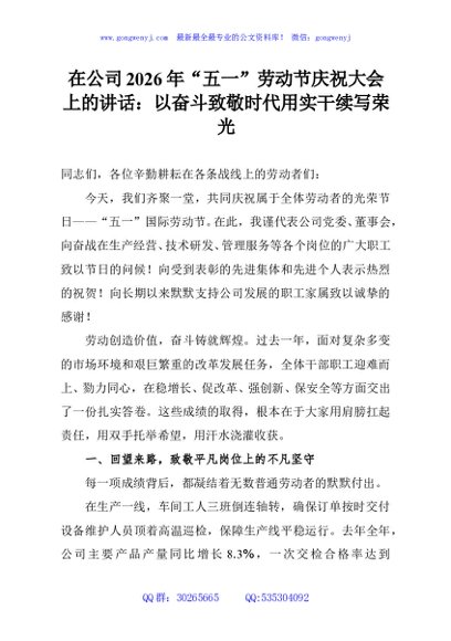 / 在公司2026年“五一”劳动节庆祝大会上的讲话:以奋斗致敬时代用实干续写荣光