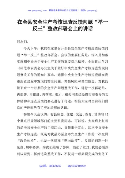/ 在全县安全生产考核巡查反馈问题“举一反三”整改部署会上的讲话