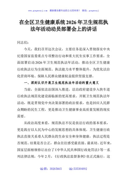 / 在全区卫生健康系统2026年卫生规范执法年活动动员部署会上的讲话