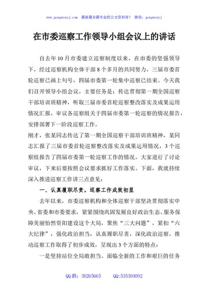 / 在市委巡察工作领导小组会议上的讲话