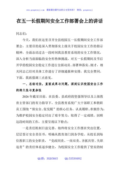 / 在五一长假期间安全工作部署会上的讲话