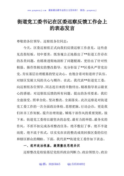 / 街道党工委书记在区委巡察反馈工作会上的表态发言