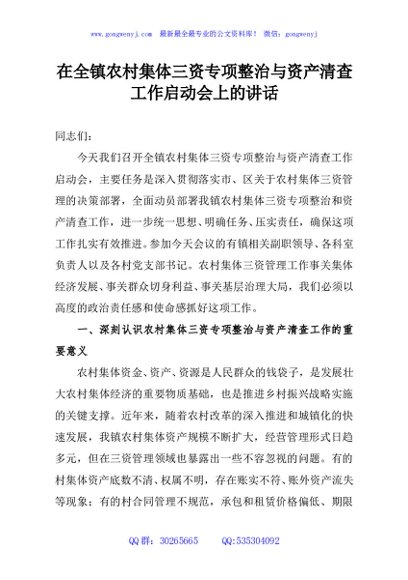 / 在全镇农村集体三资专项整治与资产清查工作启动会上的讲话