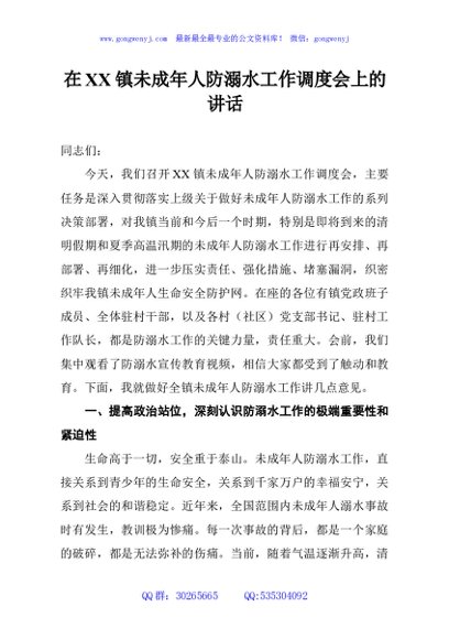 / 在XX镇未成年人防溺水工作调度会上的讲话