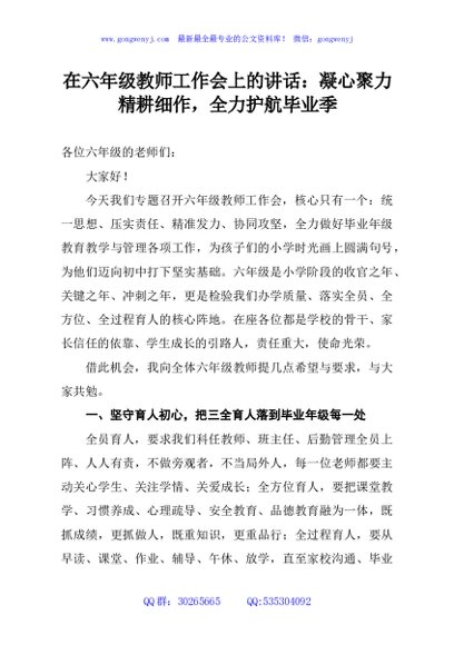 / 在六年级教师工作会上的讲话:凝心聚力精耕细作,全力护航毕业季
