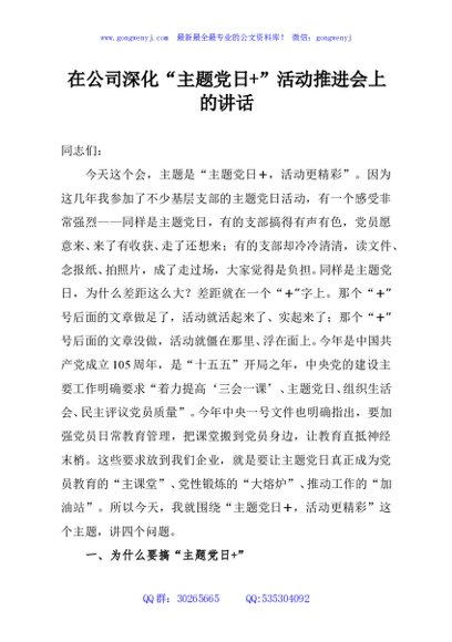 / 在公司深化“主题党日+”活动推进会上的讲话