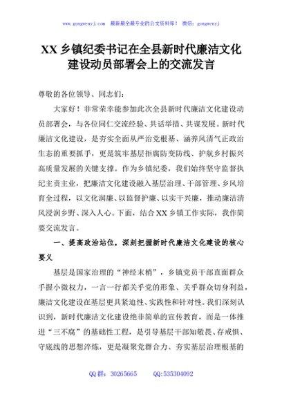 / XX乡镇纪委书记在全县新时代廉洁文化建设动员部署会上的交流发言