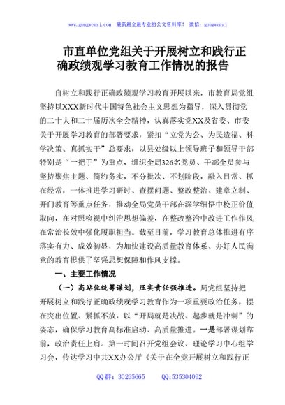 / 市直单位党组开展树立和践行正确政绩观学习教育工作情况的报告