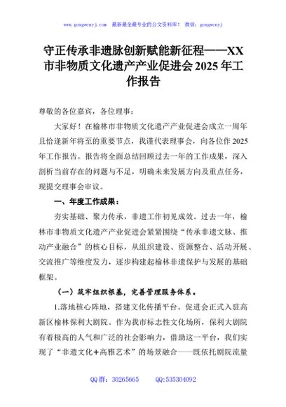 / 守正传承非遗脉创新赋能新征程——XX市非物质文化遗产产业促进会2025年工作报告