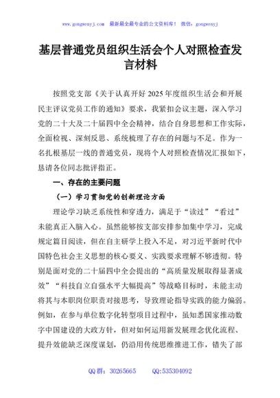 / 基层普通党员组织生活会个人对照检查发言材料