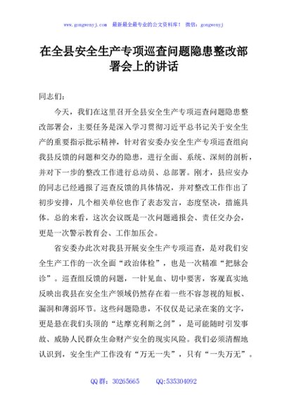 / 在全县安全生产专项巡查问题隐患整改部署会上的讲话