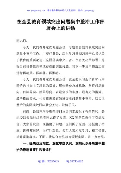 / 在全县教育领域突出问题集中整治工作部署会上的讲话