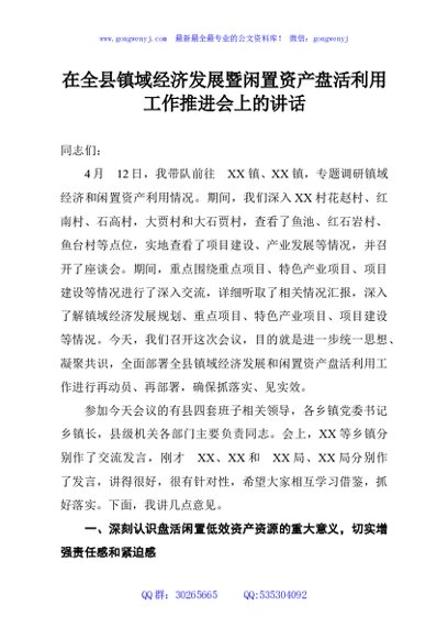 / 在全县镇域经济发展暨闲置资产盘活利用工作推进会上的讲话