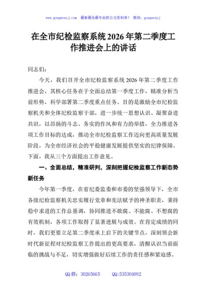/ 在全市纪检监察系统2026年第二季度工作推进会上的讲话