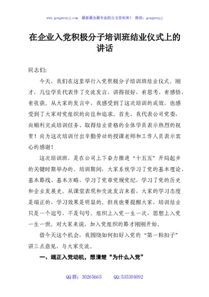 / 在企业入党积极分子培训班结业仪式上的讲话