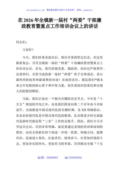 / 乡镇新一届村“两委”干部廉政教育暨重点工作培训会议上的讲话
