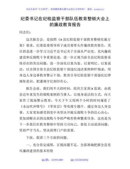 纪委书记在纪检监察干部队伍教育整顿大会上的廉政教育报告5800字