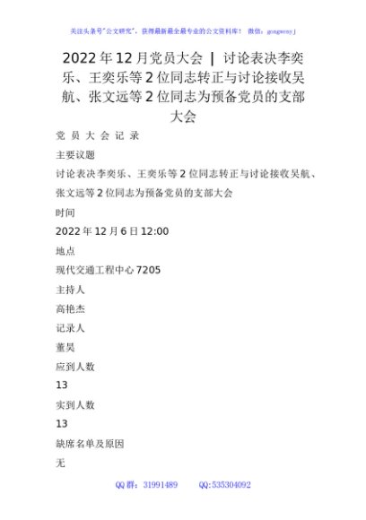 2022年12月党员大会 - 讨论表决李奕乐、王奕乐等2位同志转正与讨论接收吴航、张文远等2位同志为预备党员的支部大会