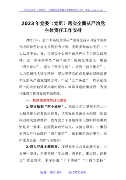 / 2023年党委(党组)落实全面从严治党主体责任工作安排