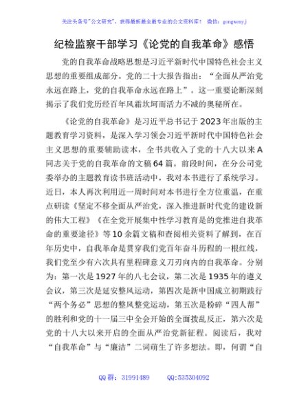 / 纪检监察干部学习《论党的自我革命》感悟