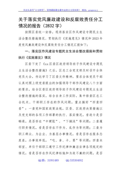 / 党风廉政建设和反腐败责任分工情况的报告