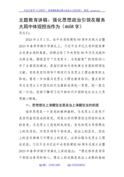 / 主题教育讲稿:强化思想政治引领在服务大局中体现担当作为