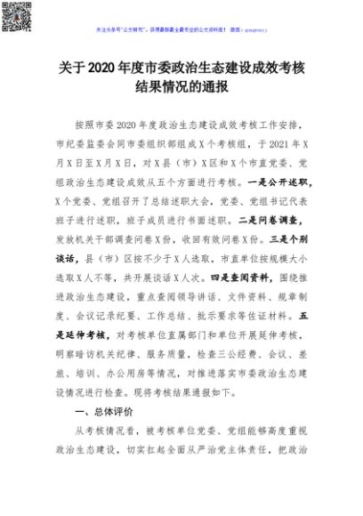关于2020年度市委政治生态建设成效考核结果情况的通报