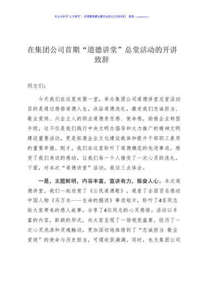 / 在集团公司首期道德讲堂总堂活动的开讲致辞