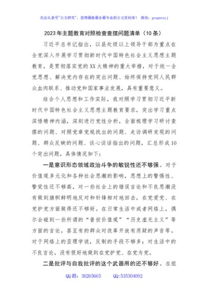 / 2023年主题教育对照检查查摆问题清单(10条)