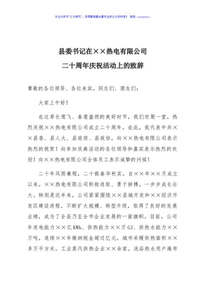 / 县委书记在××热电有限公司二十周年庆祝活动上的致辞