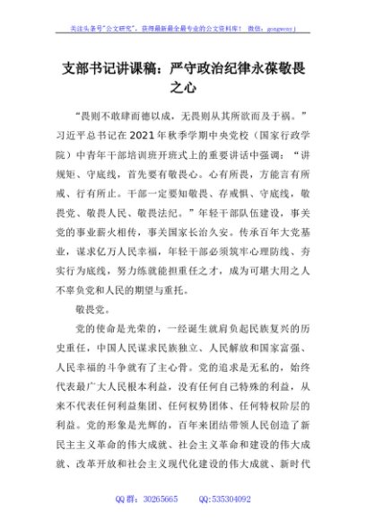 未生成预览图,长按二维码添加 支部书记讲课稿:严守政治纪律 永葆敬畏之心 - 公文研究