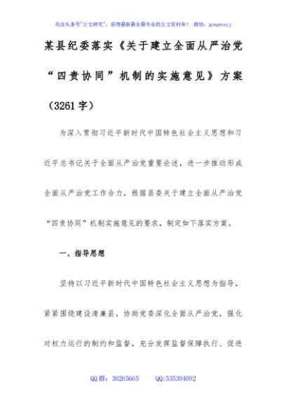 / 某县纪委落实《关于建立全面从严治党“四责协同”机制的实施意见》方案