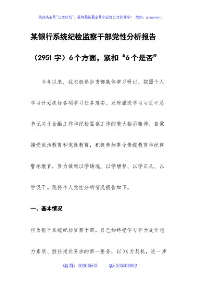 / 国企银行系统纪检监察干部党性分析报告(6个方面,紧扣“6个是否”
