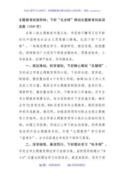 / 主题教育经验材料:下好“五步棋”推动主题教育向纵深发展