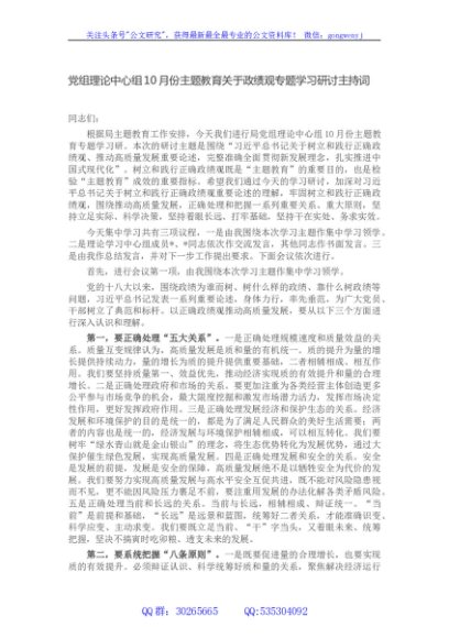 / 党组理论中心组10月份主题教育关于政绩观专题学习研讨主持词