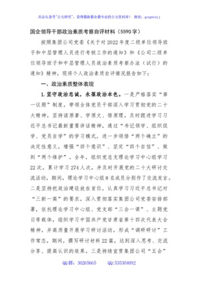 / 国企领导干部政治素质考察自评材料
