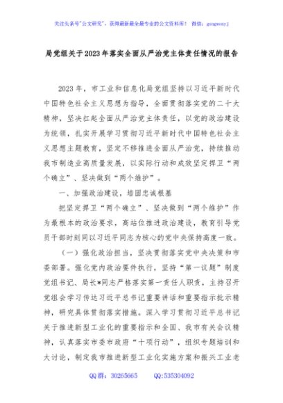 / 局党组关于2023年落实全面从严治党主体责任情况的报告