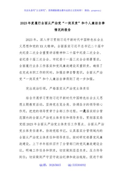 / 2023年度履行全面从严治党“一岗双责”和个人廉洁自律情况的报告