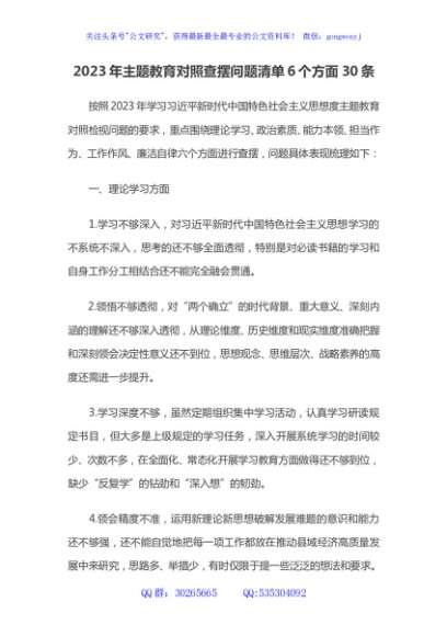 / 2023年主题教育对照查摆问题清单6个方面30条