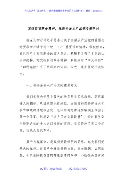 / 发扬自我革命精神,推进全面从严治党专题研讨