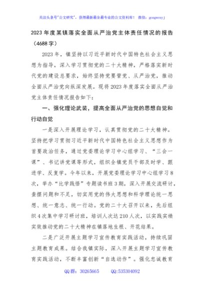 / 2023年度某镇落实全面从严治党主体责任情况的报告
