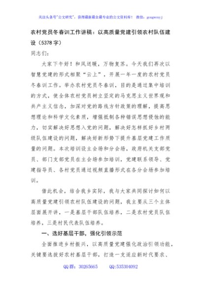 / 农村党员冬春训工作讲稿:以高质量党建引领农村队伍建设