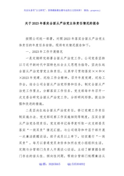 / 关于2023年落实全面从严治党主体责任情况的报告