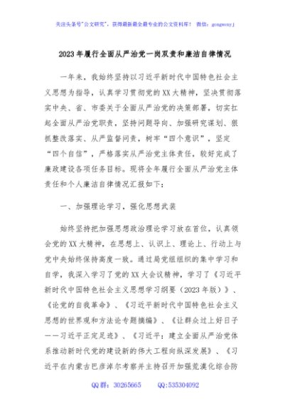 / 2023年履行全面从严治党一岗双责和廉洁自律情况