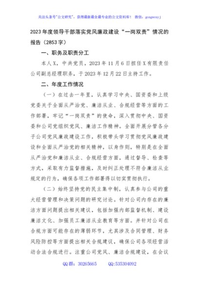 / 2023年度领导干部落实党风廉政建设“一岗双责”情况的报告