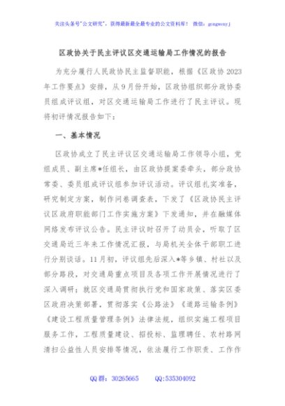 / 区政协关于民主评议区交通运输局工作情况的报告