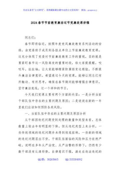 / 2024春节节前教育廉洁过节党廉政课讲稿
