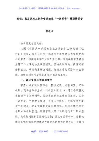 / 投稿:基层党建工作和管党治党“一岗双责”履职情况督查报告